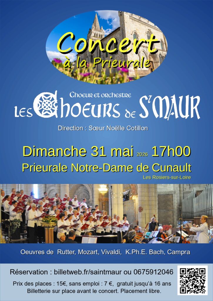 Un Concert à la Prieurale Notre Dame de Cunault aux Rosiers-sur-Loire le Dimanche 31 mai 2026 à 17h00 ; des oeuvres de Rutter, Campra, Vivaldi, Mozart, C.P.E. Bach, et d'autres.